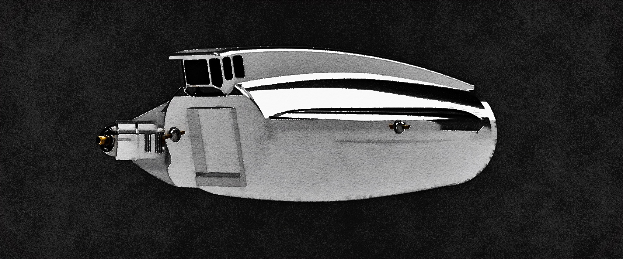 A broad starboard wing houses two internal passenger and crew decks and carries a line of small warm lit windows that frame views of distant nebulae. At its tip rests a rugged industrial airlock with exposed metal latches that signal its practical nature. Along the leading edge, a compact ion cannon turret stands ready for defensive action. Additional tri barrel energy cannon turrets are positioned below the bridge, within the port hull and above the glowing aft engines. The port side presents a clean sweep of smooth chrome plating interrupted only by the recessed weapons system. An ivory escape capsule sits within the aft portion of the wing, always prepared for emergencies.