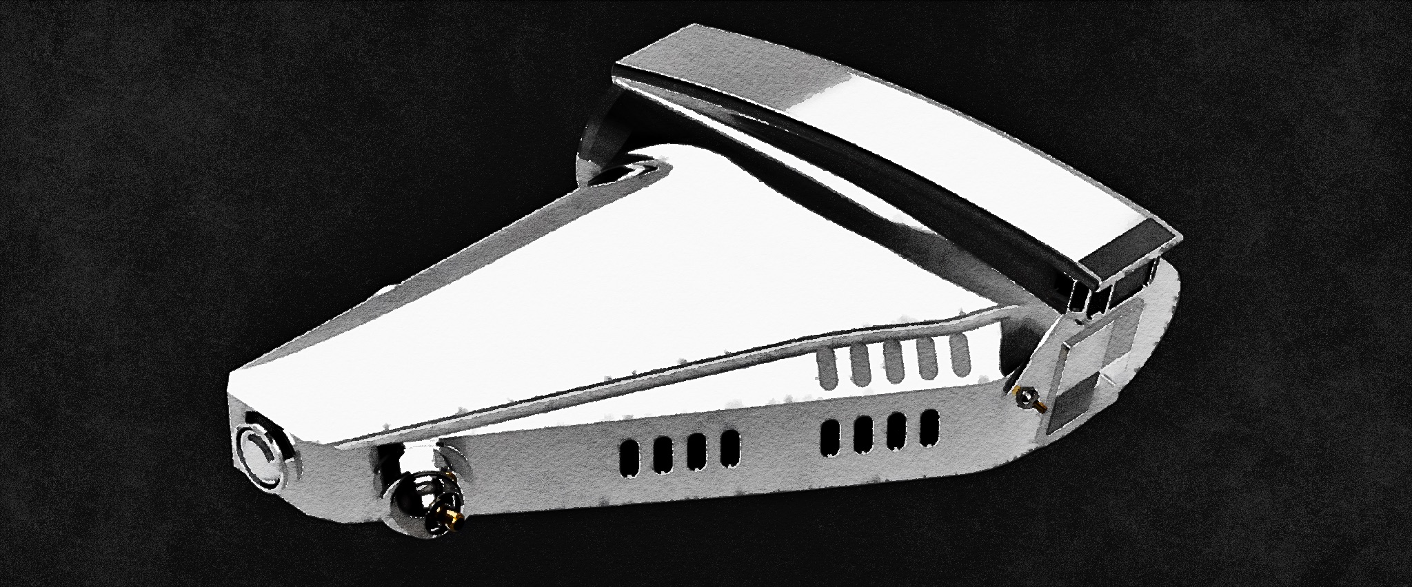 The Convor Class Expeditionary Clipper from the bespoke ship builder, the Gallofree Nubian Consortium, is a rare fusion of elegance, capability and frontier ready engineering. Designed and built prior to the Clone Wars for explorers, naturalists and dignitaries who demanded refinement without surrendering performance, this polished chrome yacht moves through deep space with a graceful presence that makes a statement at every port of call. Every surface is smooth and seamless, shaped to slip effortlessly through vacuum or atmosphere. Its profile is unmistakable, with a sculpted fuselage crowned by a forward glass bridge and reinforced cargo doors beneath.